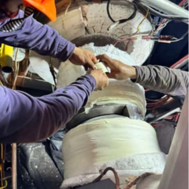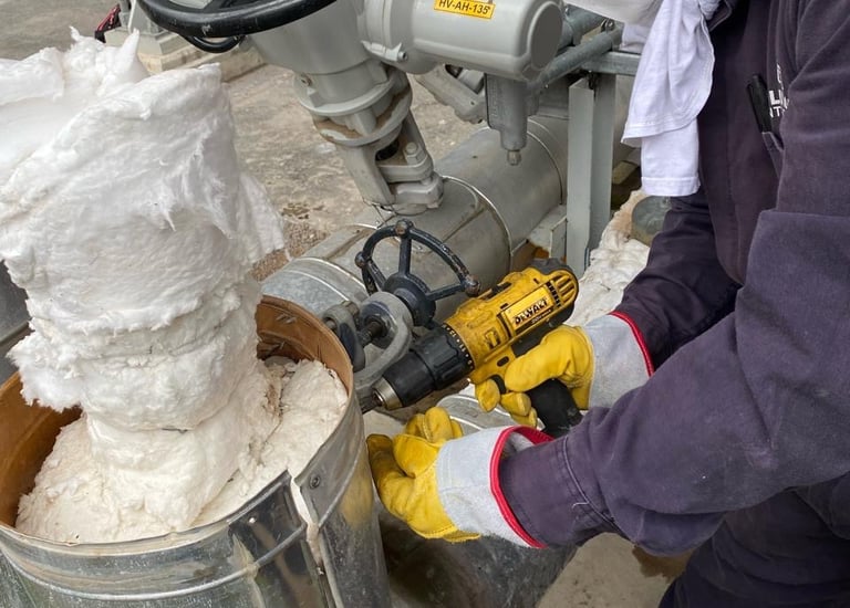Se presenta trabajo de instalación de aislamiento térmico en líneas de proceso dentro de la Central Altamira ATV. Esta intervención se realiza para conservar la temperatura de operación, mejorar la eficiencia energética y proteger los sistemas ante condiciones térmicas exigentes. El proceso se ejecuta con materiales y técnicas especializadas, garantizando seguridad, durabilidad y óptimo desempeño en la operación industrial.